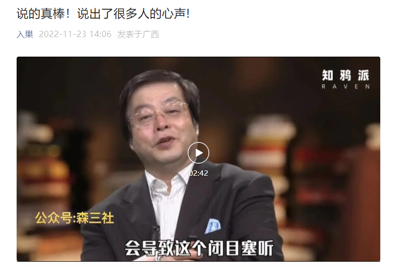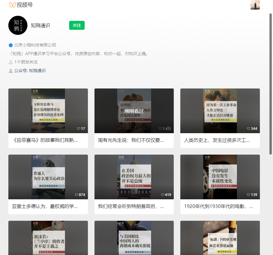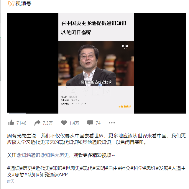 这个号名为“知鸦通识”,还有个联动账号“知鸦大历史”,视频内容是周大伟讲的所谓《在中国要更多的提供通识知识以免闭目塞听》。