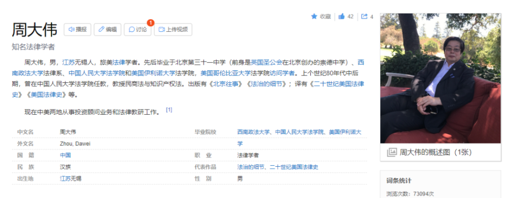 周大伟,据公开的资料显示,是旅美法律学者,毕业于西南政法大学法律系、中国人民大学法学院和美国伊利诺大学法学院,上个世纪80年代中后期,曾在中国人民大学法学院任教,教授民商法与知识产权法,后是美国哥伦比亚大学法学院访问学者。现在呢,是所谓的“中美两地从事投资顾问业务和法律教研工作”。