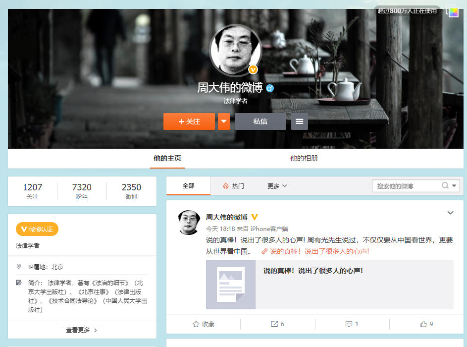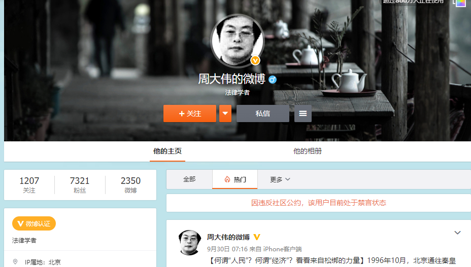 更有意思的是,所谓的“长期旅居美国”的周大伟,在微博显IP功能下现了原形,原来这个所谓的“中美两地从事投资顾问业务和法律教研工作”的周大伟,长居地是在北京。