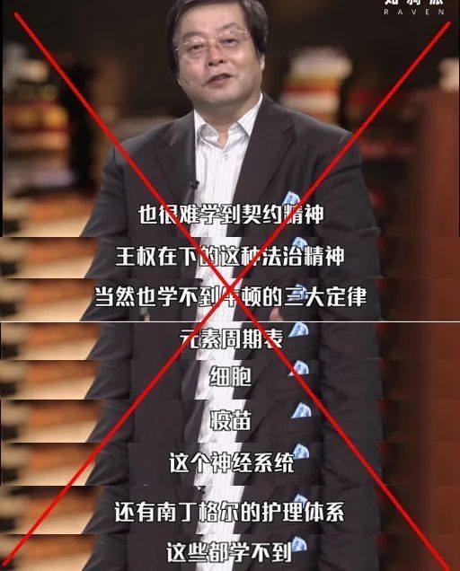 周大伟扬言:“(学中国历史)很难学到契约精神、王权在下的法治精神、牛顿三大定律、元素周期表、细胞、疫苗......神经系统、南丁格尔的护理体系,这些都学不到。”