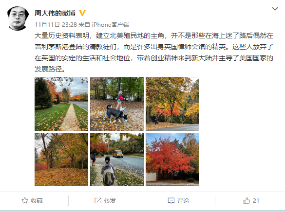 周大伟在其微博账号上更是声称建立北美殖民地的是英国律师会馆的精英,是放弃在英国的安定生活和社会地位,去北美大陆创业的。