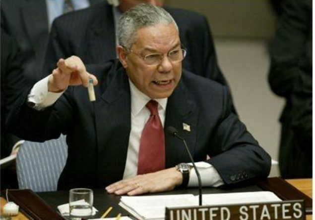 美国以一小瓶洗衣粉为所谓的“大规模杀伤性武器”的证据,发动对伊拉克的侵略战争,杀死至少200万伊拉克平民。