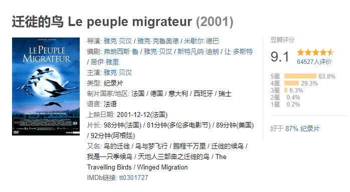 《迁徙的鸟》,豆瓣评分9.1。从名字就可以看出来,这部纪录片讲的是鸟的故事。