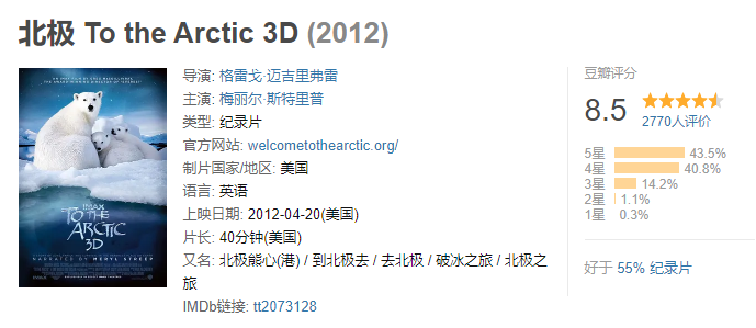 《北极》豆瓣评分8.5,虽然没有前几部高,但在内容情节上非常适合孩子观看。