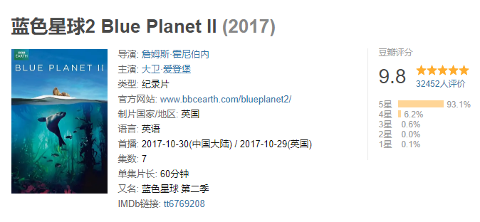 《蓝色星球2》豆瓣评分9.8。整体来说,第二部比第一部温和了很多,海洋生物之间弱肉强食的场面减少,孩子的接受度也相对更高。