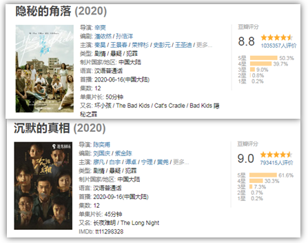 诞生于2020年第二季度的「迷雾剧场」,“出生”即迎高光。6月16日上线的自制悬疑短剧《隐秘的角落》,播出两天豆瓣便开出了9.2的高分,截至目前,该剧在豆瓣评分为8.8,打分人数超百万。9月16日,改编自紫金陈小说《长夜难明》的悬疑短剧《沉默的真相》上线,全网热议及高口碑再次验证了国产悬疑剧的实力,目前该剧豆瓣评分仍高达9.0。