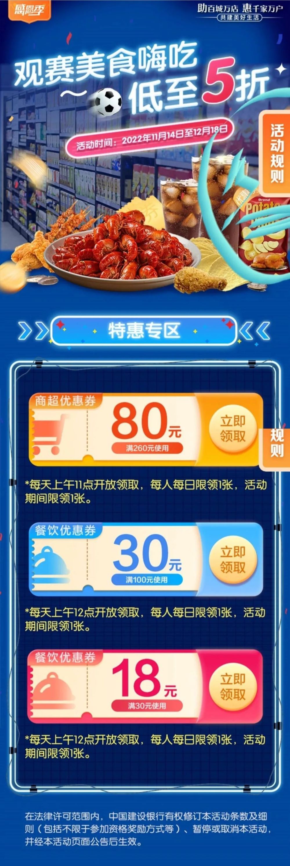 卡塔尔世界杯期间,“建行生活”APP在每天上午11时和12时发放餐饮满30减18、满100减30、商超满260减80等优惠券。
