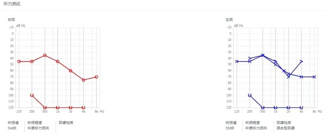 轻度损伤主要表现为耳鸣出现较早,呈双耳持续性高频声,听力下降为缓慢下降。如果进一步加重,会在一定程度上影响语言听力,致使工作、学习、生活中感到听觉困难。甚至一次强烈的噪音可导致暂时性的双耳全聋,同时感到剧烈耳鸣并眩晕。此外随着噪声暴露时间的延长,听力损失会逐渐不可逆转,并扩展至3000、8000Hz等频段。比如何叔叔的听力图,就是典型的噪音性耳聋,听力曲线呈V型或U型凹陷,凹陷的中心位置多在4000HZ或6000HZ,这是由于人耳在这个频率时听力损伤的速度和程度最明显。