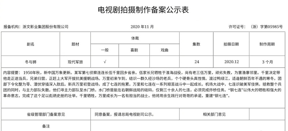 片方以“’钢七连‘已集结,铁骨铮铮,保家卫国!”作为宣传语,吸引了众多网友的关注,目前,《冬与狮》的档期暂未公布。