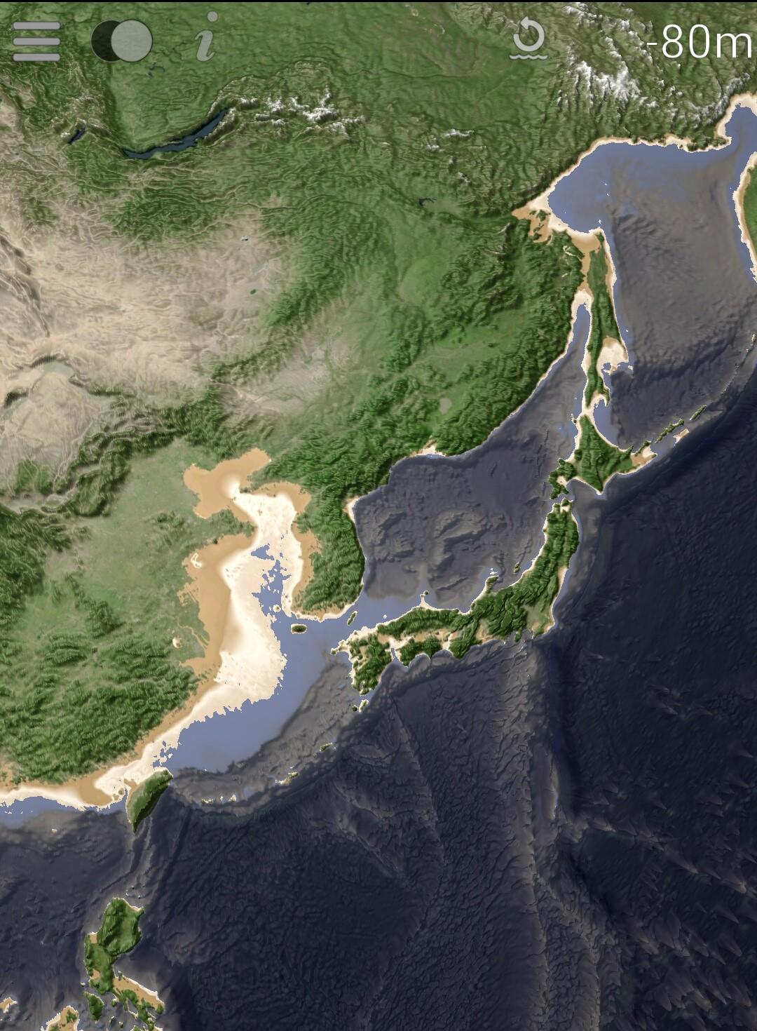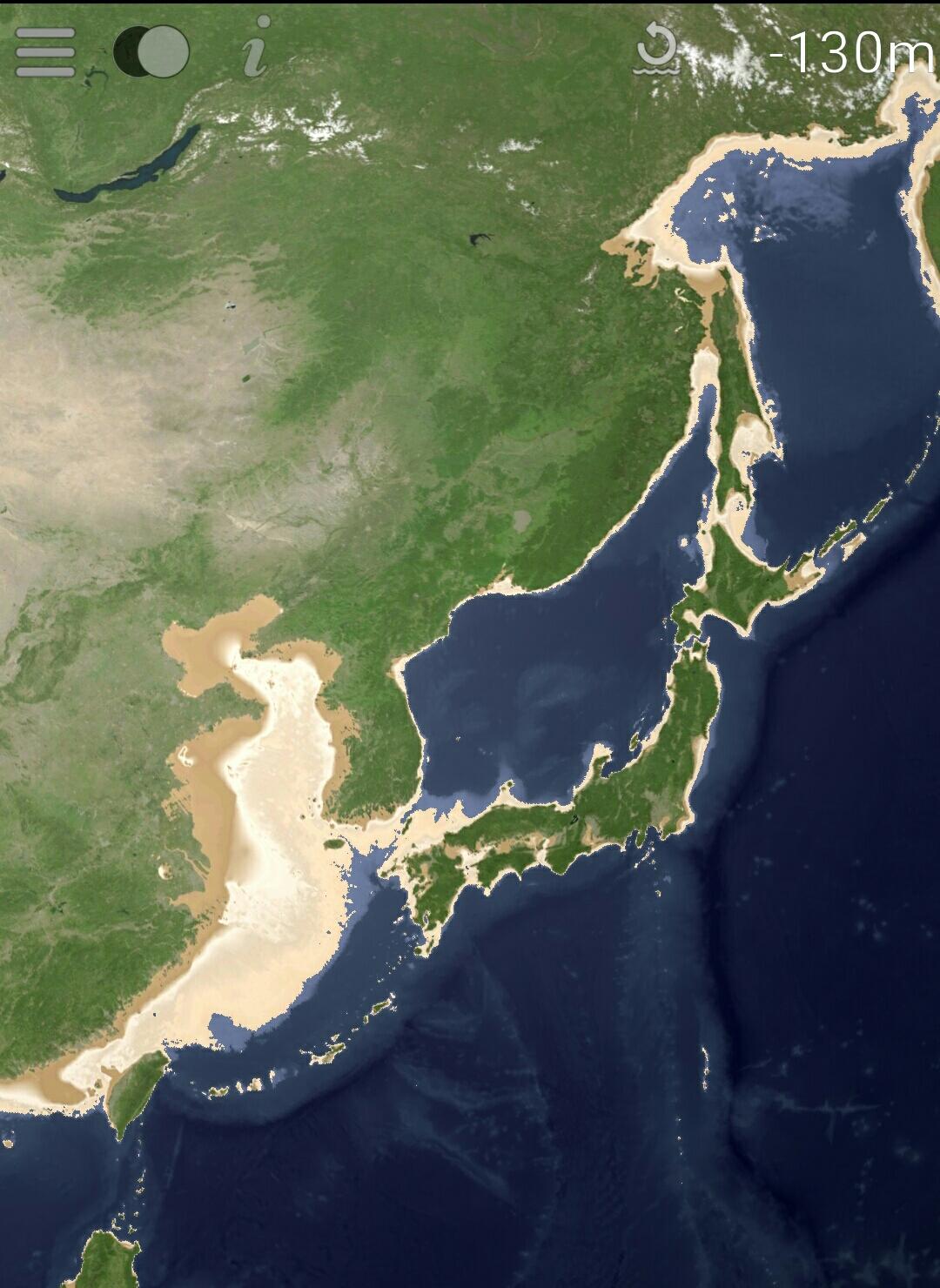 这话在原理上没错,当时确实处于冰河期,海平面也较现代低,但在7万年前大概只是比现代低了80米,还远不足以让中国与日本相连: