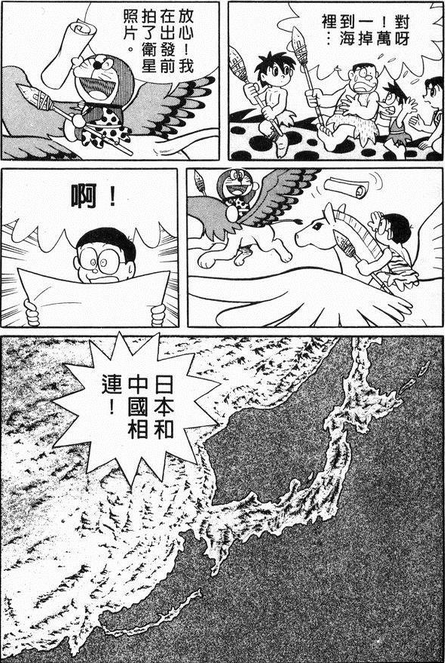哆啦A梦解释因为在冰川期海平面较低,日本和中国陆路相连,因此不用担心几只神兽飞累了掉到海里。