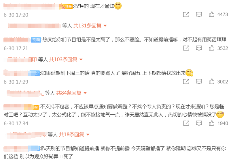 有的就在说:“现在才通知!”“不知道提前播吗?对不起有用,笑话,拜拜。”还有的在开骂:“不支持不包容,好心情都搞没了”“恋综又不是只有你们这档,别以为观众好糊弄。”