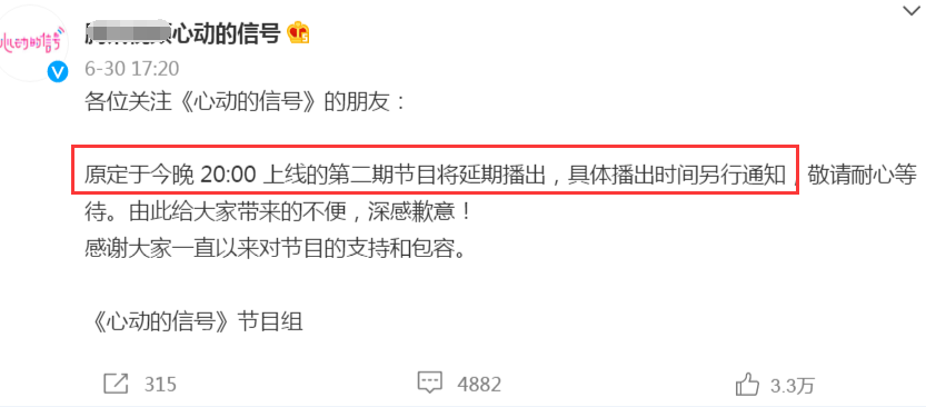 本来《心动的信号》是会在本周星期三星期四播出的,但在6月30日,《心动的信号》官博突然宣布一个消息,就是原定于晚上上线的第二期节目将延期播出,并且此番还不给出第二期的播出时间,只是说了一句“具体播出时间另行通知”,节目组这一番操作,让观众们生气了!