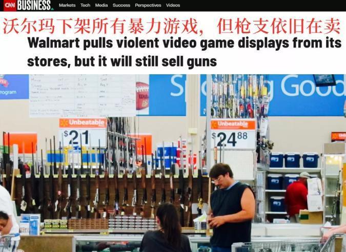 于是,我们看到了非常魔幻的一幕。美国沃尔玛超市下架了所有暴力的射击游戏,比如《战地》《使命召唤》等。但各类枪支,就像挂着的猪肉一样任人购买。