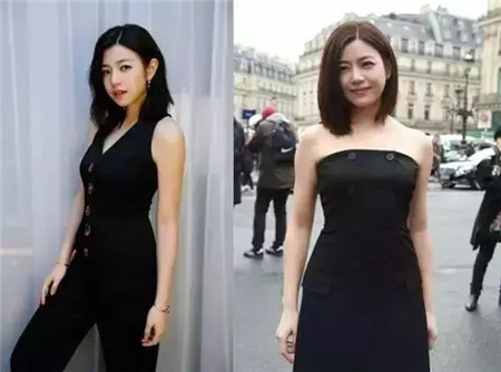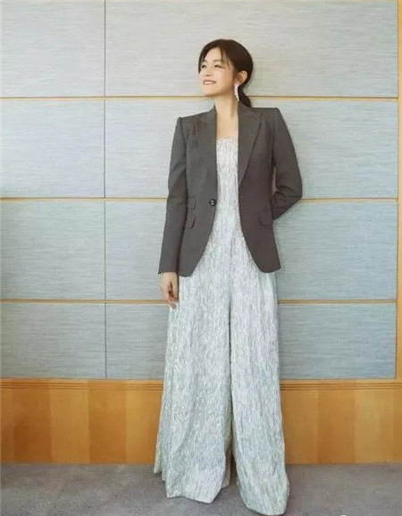 再来看这造型,银色细闪连体裤配灰色西装,光看上半身还不错,简洁、利落、时尚,但整体来看,裤子对于她来说太长了,如果改成到膝盖以上的连体裤,西装再短一点,会更显得利落洒脱。