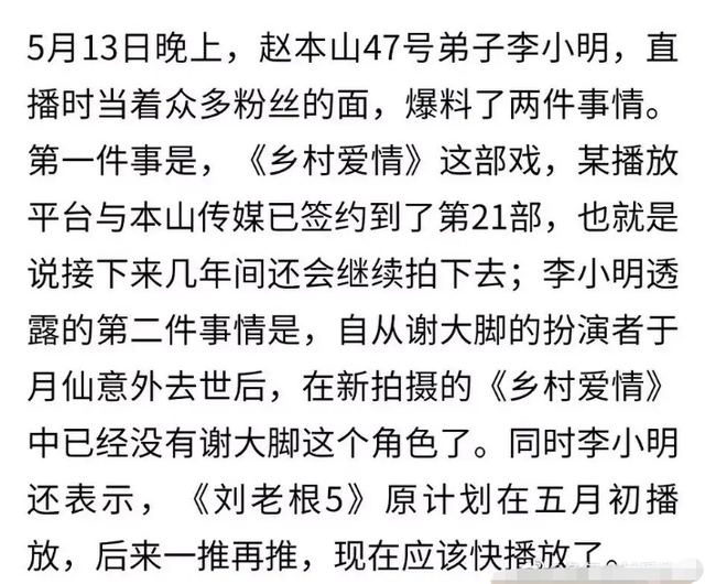 李小明在直播时提到,《乡村爱情》这部剧公司已经和网络平台签约至第21部,也就是说至少会拍到《乡村爱情21》。