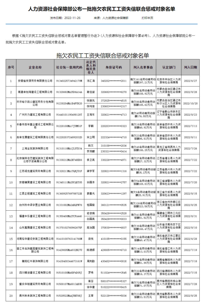 据人力资源社会保障部网站消息,根据《拖欠农民工工资失信联合惩戒对象名单管理暂行办法》(人力资源和社会保障部令第45号),人力资源社会保障部现公布一批拖欠农民工工资失信联合惩戒对象名单。