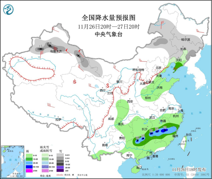 11月26日20时至27日20时,新疆北部、甘肃河西、内蒙古东部、黑龙江南部、吉林、辽宁中北部等地部分地区有小到中雪或雨夹雪,其中,新疆沿天山地区有大到暴雪(10~18毫米)。辽东半岛、江南南部、广西北部等地部分地区有中到大雨,其中,湖南南部、江西中南部、广西东北部、福建西北部局地有暴雨(50~75毫米)。新疆北部、青海东部、甘肃河西、内蒙古、黑龙江东北部等地部分地区有4~6级风,其中,新疆山口地区风力可达7~8级。青海西北部、甘肃河西等地有浮尘或扬沙(见图)。