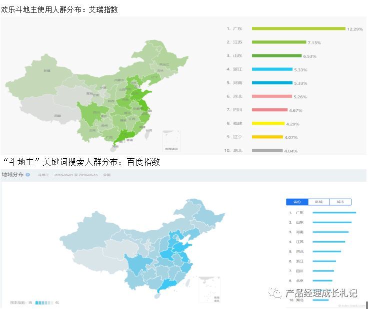 但是值得注意的是,北京作为一线城市,对于斗地主的搜索指数很高,但使用的用户占有率却没有进入前十名,这其中的原因值得深究,如果能够搞清楚为什么会出现这一异常,对于欢乐斗地主更加深入的了解市场,以此来做产品上的调整和创新是具有极大价值的。