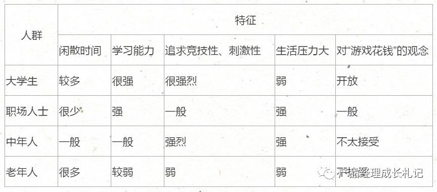 已经成家的中年人群:这一类人士已经成家,有稳定的工作,奋斗热情较低,对生活感到乏味,对现今的娱乐方式并不感兴趣并且有丰富的线下棋牌玩乐史,找人线下举行棋牌活动较难,于是选择在空闲的时候进行“线上棋牌”娱乐。