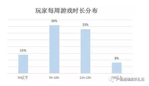 同时,由于移动端棋牌游戏的出现,使得一切碎片时间都可以参与其中。调查数据显示,在玩家每周游戏时长分布方面,处于5h-10h和11h-15h的占比较多,分别为36%和33%,其中每天游戏时长在1h的玩家较多,这与棋牌游戏单轮游戏时长有着直接关联;仅有8%的玩家每周游戏时长在15h以上。