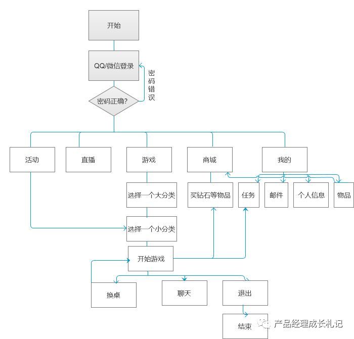使用流程图如上所示,用户先可以通过QQ账号或者微信账号登录,然后可选择活动、直播、商城、我的,或者直接进游戏选择页面,在众多游戏模式中选择自己想玩的模式,游戏过程中可以和同一页面的用户聊天,在一轮游戏结束后,可以选择退出游戏或者买钻石/福卡、确认任务完成情况等。