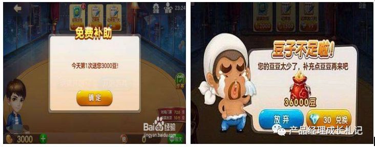 欢乐斗地主则主要是通过每天赠送6000豆,分两次赠送的方式来控制用户的豆子数量,这有点类似于“化妆品的试用装”,在体验之后就必须付账当天才能继续使用,因为豆子输完之后就需要充值钻石才能继续玩,每次充值最低是6元,数额不算很大,激励效果就会比较明显。