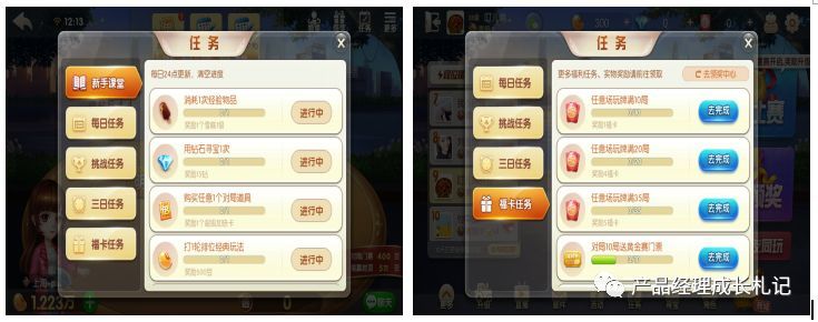 一方面,任务分为“登录”、“玩的局数”等衡量方式,以此来增加用户的活跃度,同时对于参与的新玩家特殊照顾,设置新手任务,使得不同阶段和不同忠诚度的用户都能收到相应程度的激励。