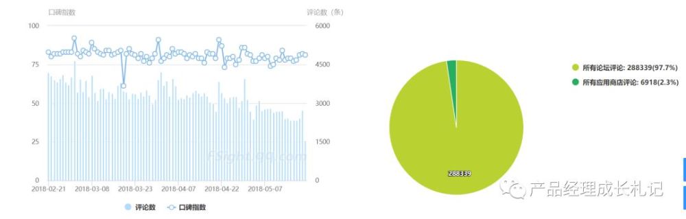 近3个月的评论数以及口碑指数如上图,论坛评论数有288339条,占97.7%,应用商店为6918条,占2.3%。