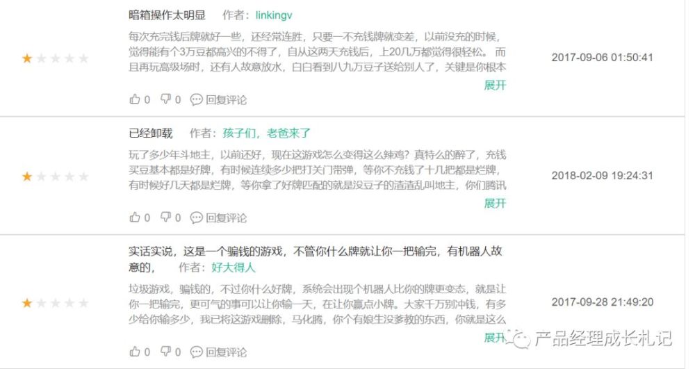 于是作者便对于一星的评论进行了查询,结果如上图所示,一星的评论主要是对于游戏公平性的怀疑。部分用户表示刚刚玩游戏时游戏机制更加公平,玩到后面系统会“杀熟”式分牌,促使用户充钱。