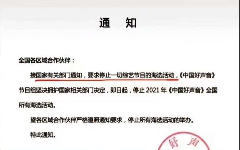 去年一段时间中国好声音曾接到国家通知,被要求停止所有综艺节目的海选。之后,部分选秀节目也停止了海选。对于国家接二连三封杀选秀节目,大部分人还是比较同意的.