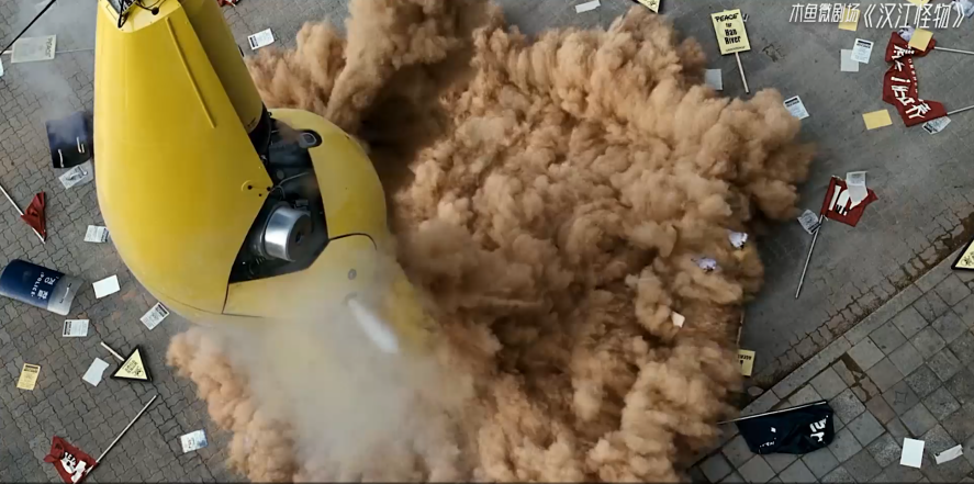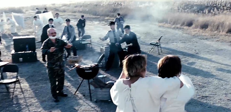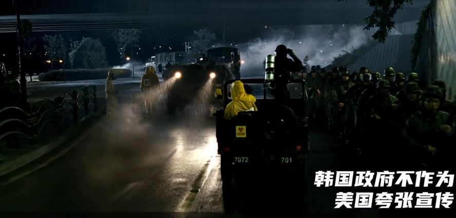 怪物本身并不强(最后是四个平民干掉了它),但美国却在新闻报道中散播虚假消息,声称美国军官是死于怪物携带的「病毒」,并要求韩国政府配合抓捕那些平民。