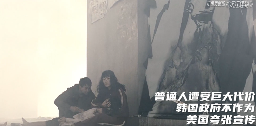 影片在反复强调「美国」这个概念,很多人自然地认为「汉江怪物」指代美国,整部影片就是讲述韩国人民反美的故事。