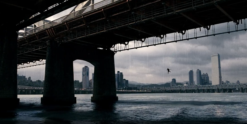 影片开始,一位西装革履的男人,脱了鞋在雨中,看着汉江里面的黑影,说了一句