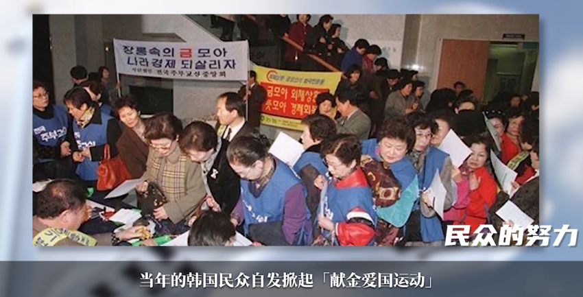为了帮助国家偿还IMF的外债,当年的韩国民众自发掀起「献金爱国运动」,纷纷把自己的黄金和美元兑换成韩元,全国人民节衣缩食,努力奋斗,直到2001年才把IMF的欠款还清。