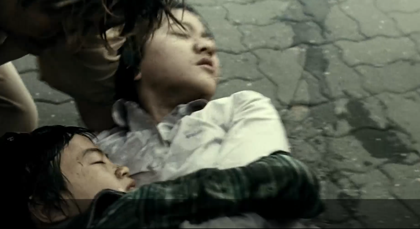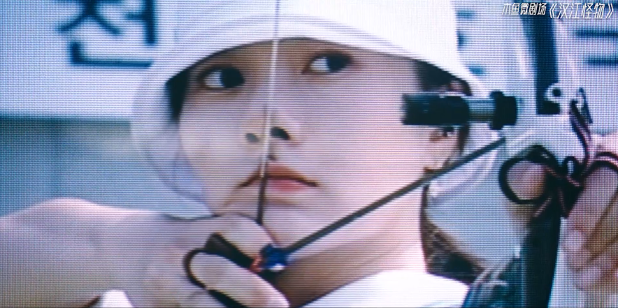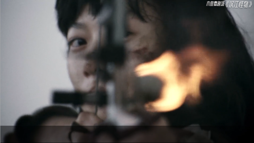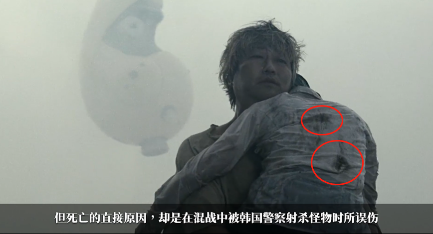 这里值得注意的对应是,虽然女儿出现危机,但她并非直接被怪物杀死,而是在混战中被韩国警察在射杀怪物时所误伤,她背上的弹孔就是证明。