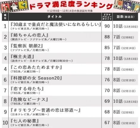 《到了30岁还是处男,似乎会变成魔法师》连续五周在这个满意度调查中排名第一,这在深夜档日剧中是前所未有的。