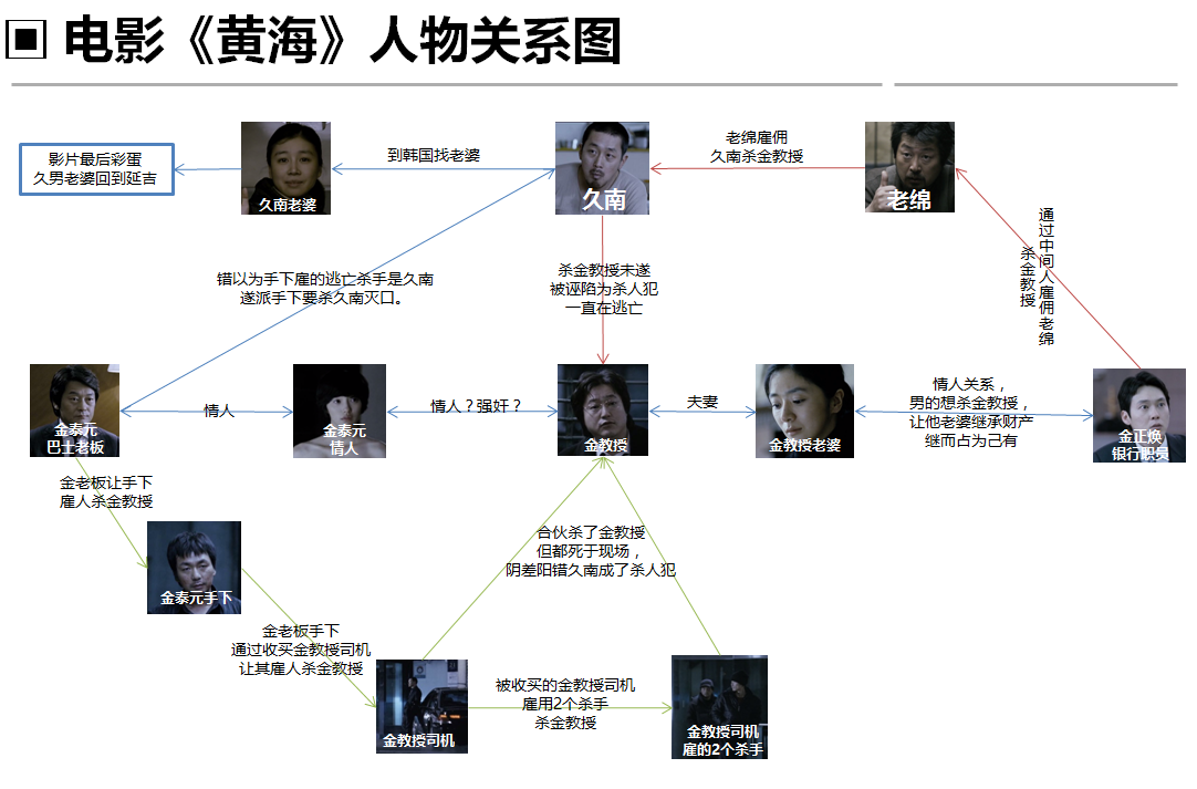 1,金承贤(死者金教授)的老婆和银行科长金正焕有奸情所以合伙雇人杀教授,通过酒店老板的老婆搭上了绵正鹤的关系,老绵雇了久南(河正宇)
