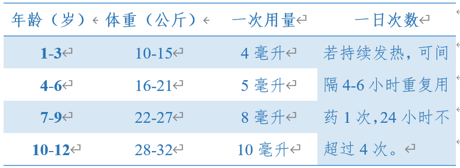 对乙酰氨基酚和布洛芬口服液体剂型是儿童最常用的退热药,需要依据年龄和体重调整给药剂量,1岁以下儿童请遵医嘱,1岁及以上儿童具体用法如下: