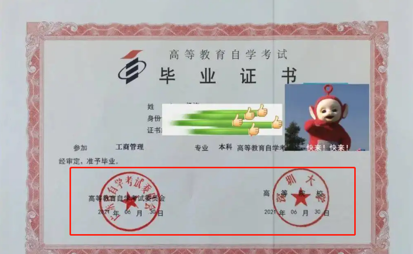 自考证书上盖着两个印章,一枚是学校的印章,一枚是省考试委员会的印章。比如说,你读的是自学考试,无论你就读于哪个学校,你的毕业证上都会有你所在学校和省自学考试委员会的印章。