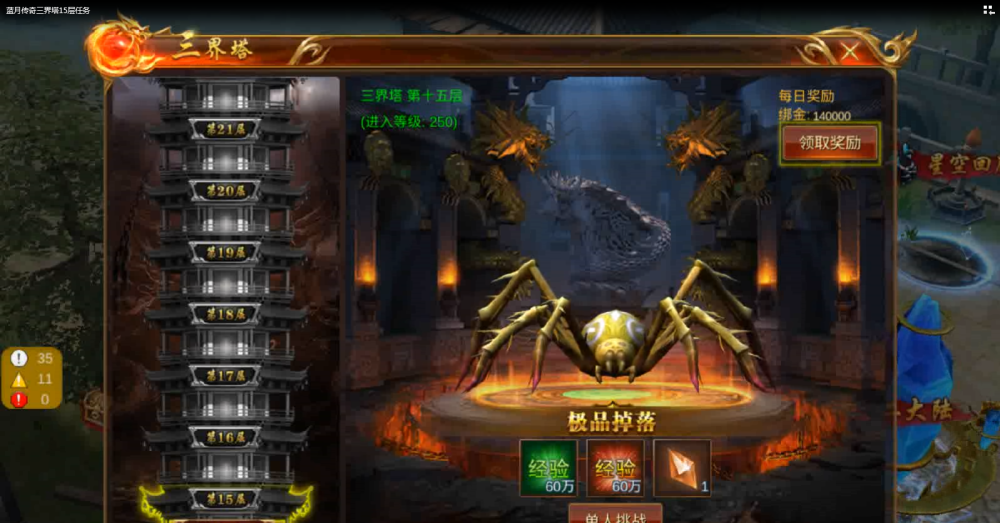 蓝月传奇手游沉默版三界塔任务,玩家每日登录蓝月传奇手游沉默版游戏都可以接三界塔任务,在每日的三界塔任务中玩家还可以获得每日奖励,绑金140000,随着每日三界塔任务的完成,玩家在第十五层的时候需要玩家达到250级,才可进行三界塔第十五层的任务,在第十五层玩家可以获得极品掉落的奖励,60w的经验值*2和物防宝石*1,可以增加玩家的物理防御能力,减少刷怪带来的伤害。
