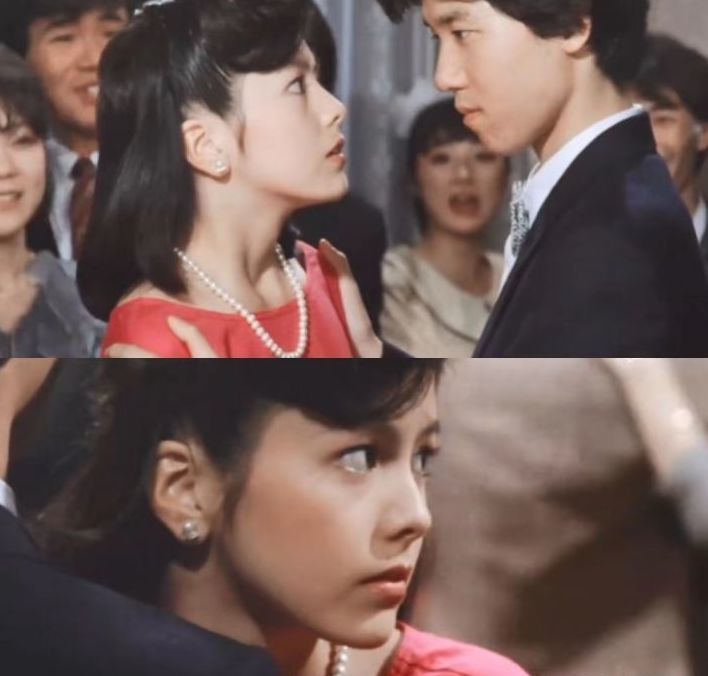 其实这部剧是1975年的作品,当时的山口百惠只有16岁。那时的她,眼睛一单一双,五官也不算立体,怎么看都算不上是第一眼美人。