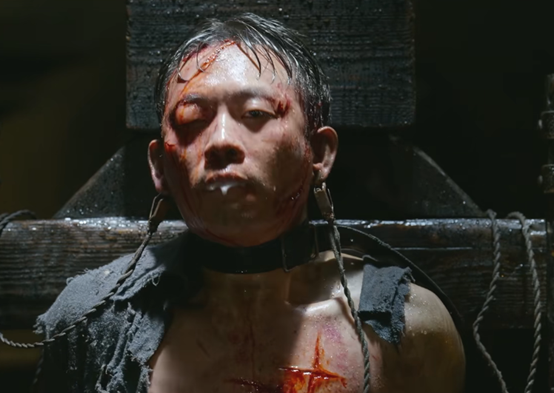 他饰演的张宪臣显然已经受到非人的待遇,疤痕遍布全身,眼睛肿的睁不开。
