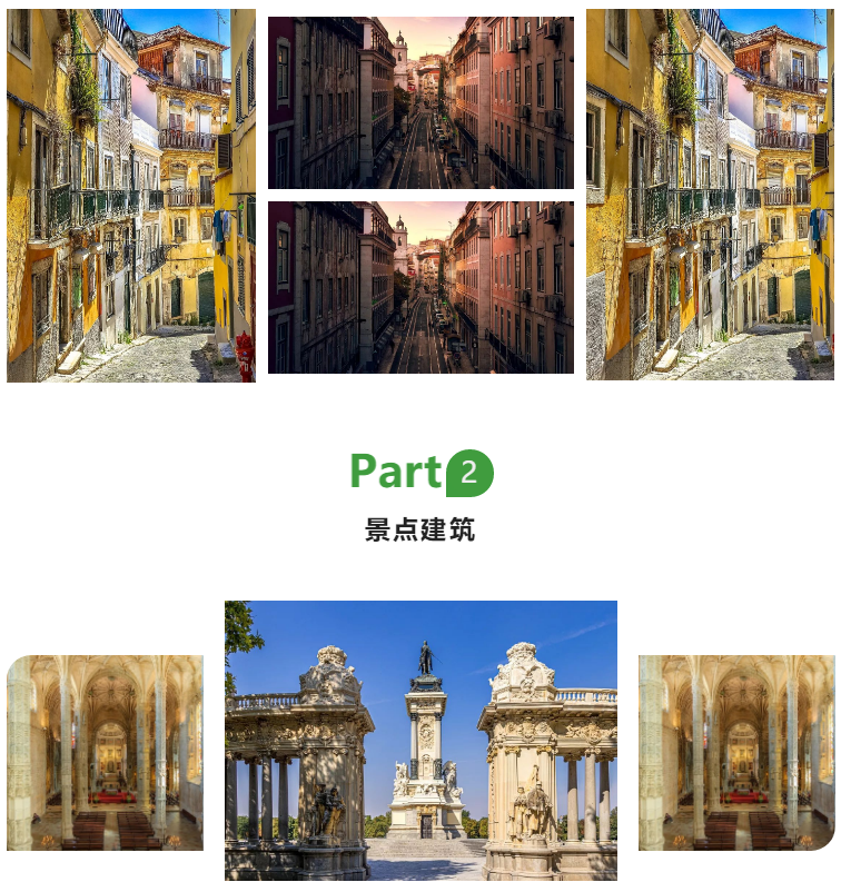 里斯本:里斯本范围并不大,是一个十分适合步行的城市。市区的历史古迹类景点保存得很好,一些修道院、教堂、宫殿和城堡等都非常值得一看。