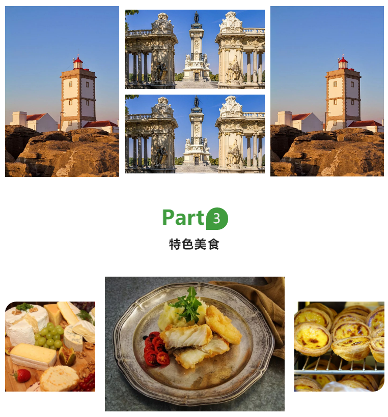 葡式鳕鱼:鳕鱼文化节是葡萄牙的特色节日之一,在葡萄牙的各个城市,到处都可以见到专门做葡式鳕鱼的店铺,和葡萄牙的蛋挞一样的有名。