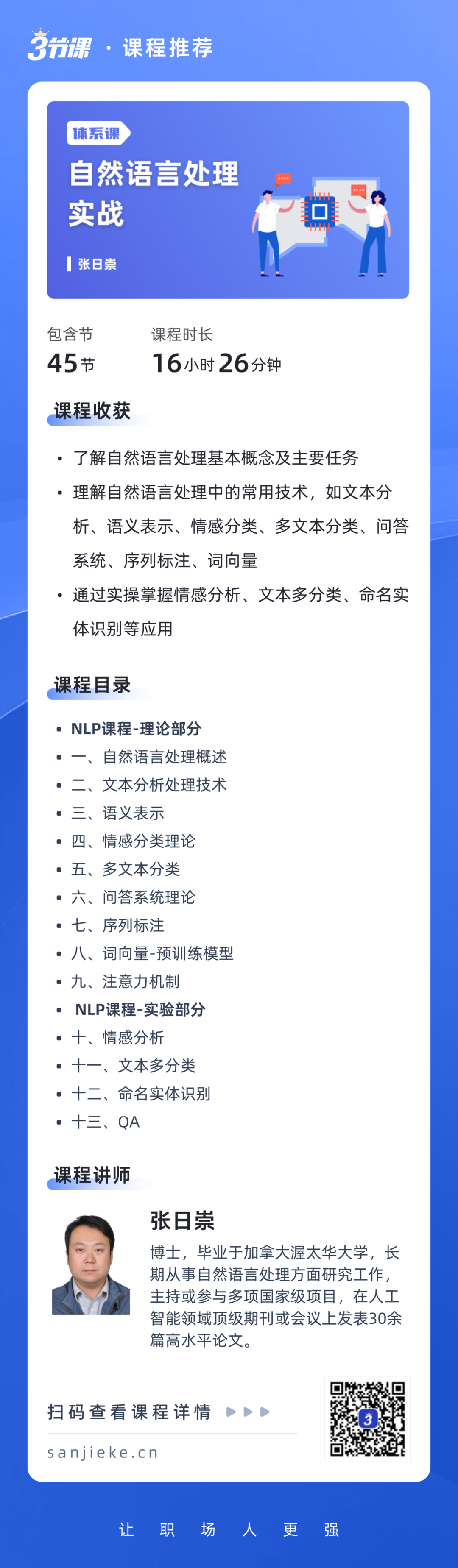 本课程基于百度深度学习框架飞桨PaddlePaddle,帮助学生通过实战的方式系统了解文本分类、情感分析和基于问答检索的自然语言处理系统。