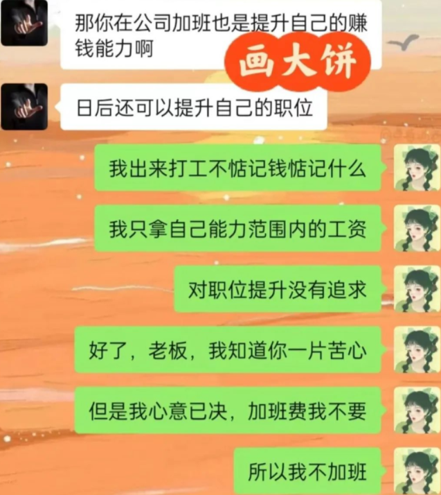 比起上一位老板的直截了当,这位老板则是给毕业生画起了大饼,但这招对别人可能管用,但是到了00后这里,就未必了,“出来打工不惦记钱惦记什么,对职位提升没追求”,直接不给老板可以攻击的弱点。
