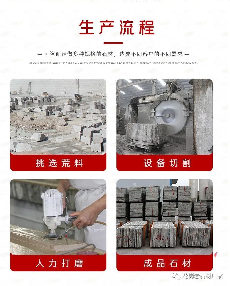花岗岩岩体在我国约占国土面积的9%,达80多万平方公里,尤其是东南地区,大面积裸露各类花岗岩体,可见其储量之大。石种的表面处理有各种各样的加工方法,比如说磨光面、火烧面、荔枝面等等。据不完全统计,花岗岩石约有300多种,其中花色比较好的可分为红、黑、绿、灰、白、黄等六大系列。