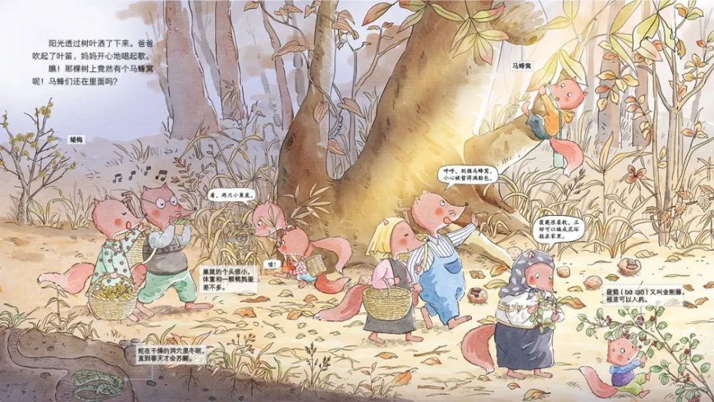 这是什么花?那是什么鸟?狐狸爸爸和伯伯背着什么劳动工具?小狐狸呼呼在做什么?小不点表弟冬子又跑到哪里去了?