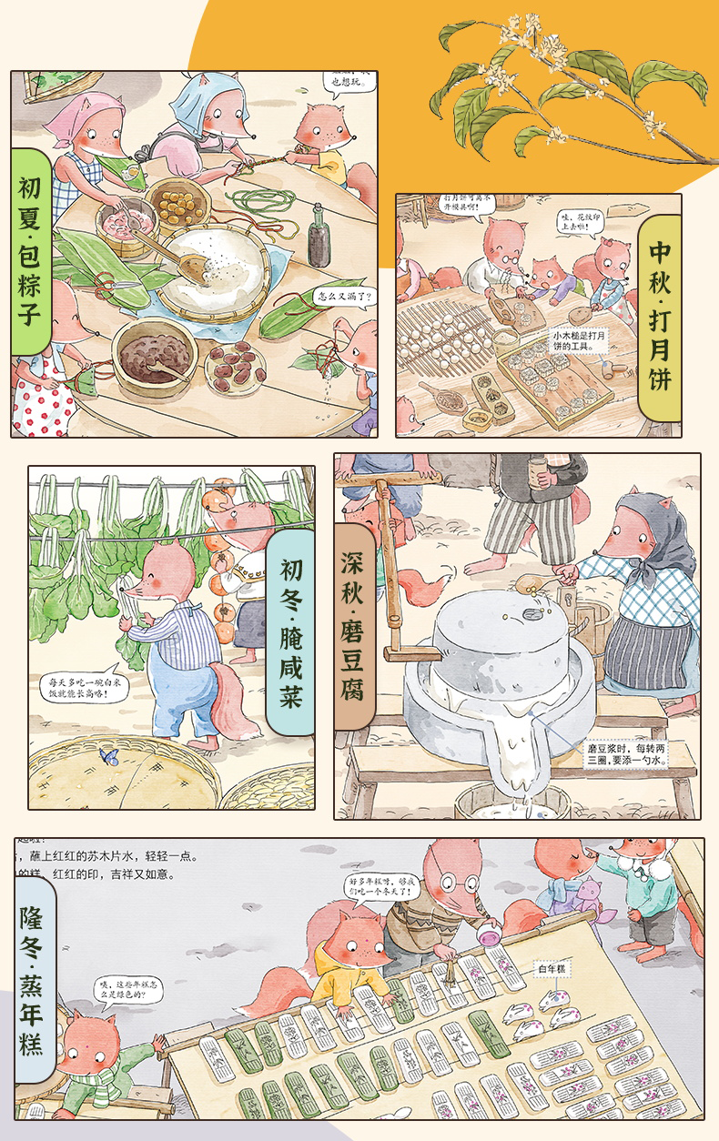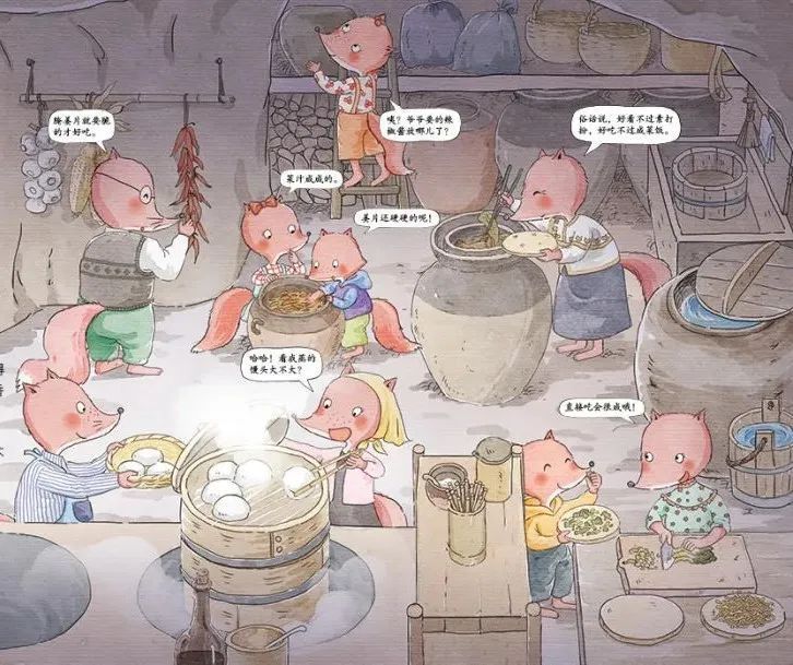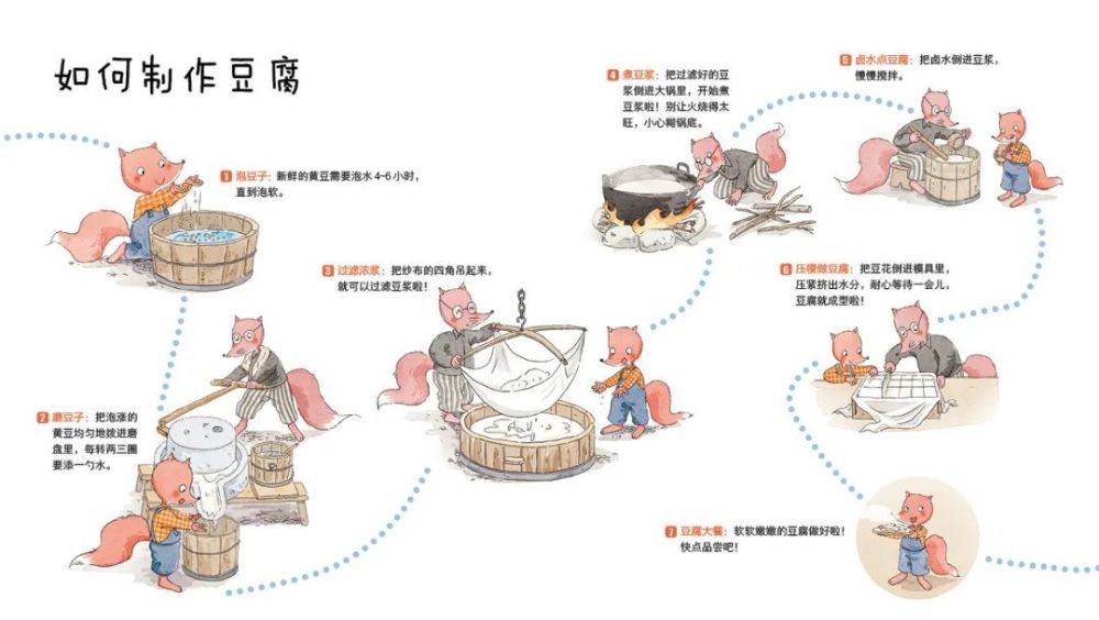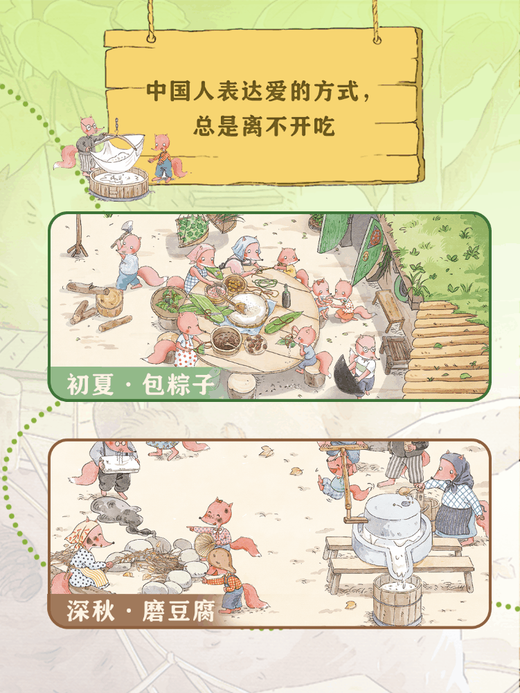 眼下这套《狐狸家的中国味道》就很应景:孩子看完之后,不仅会吃、会认,还会知道这些食物是从哪里来的,一道道工序又是怎么完成的。